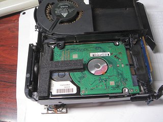 6.ハードディスクを留めているビス4本を外して、引き抜き、手前から引き出す。