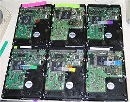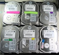 ピンクの患者HDはBIOS認識せず、ToolでもHDDが認識されない状態。 黄緑〜ブルーの5台はテスト用のHDで、それぞれは正常にBIOSで認識されるもの。 基板交換により、BIOSでは認識されないがToolで認識され、救出できたのは黄緑の基板であった。 |